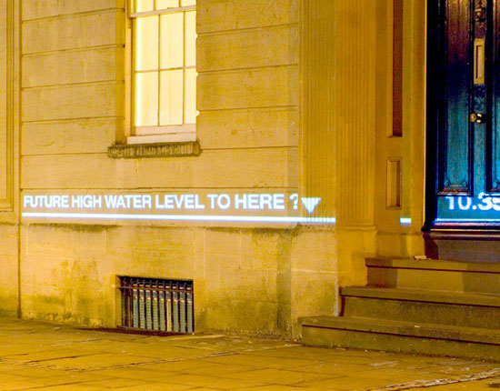 Large scale projections across buildings in Bristol showing the heights future seal levels could rise to. (2009)